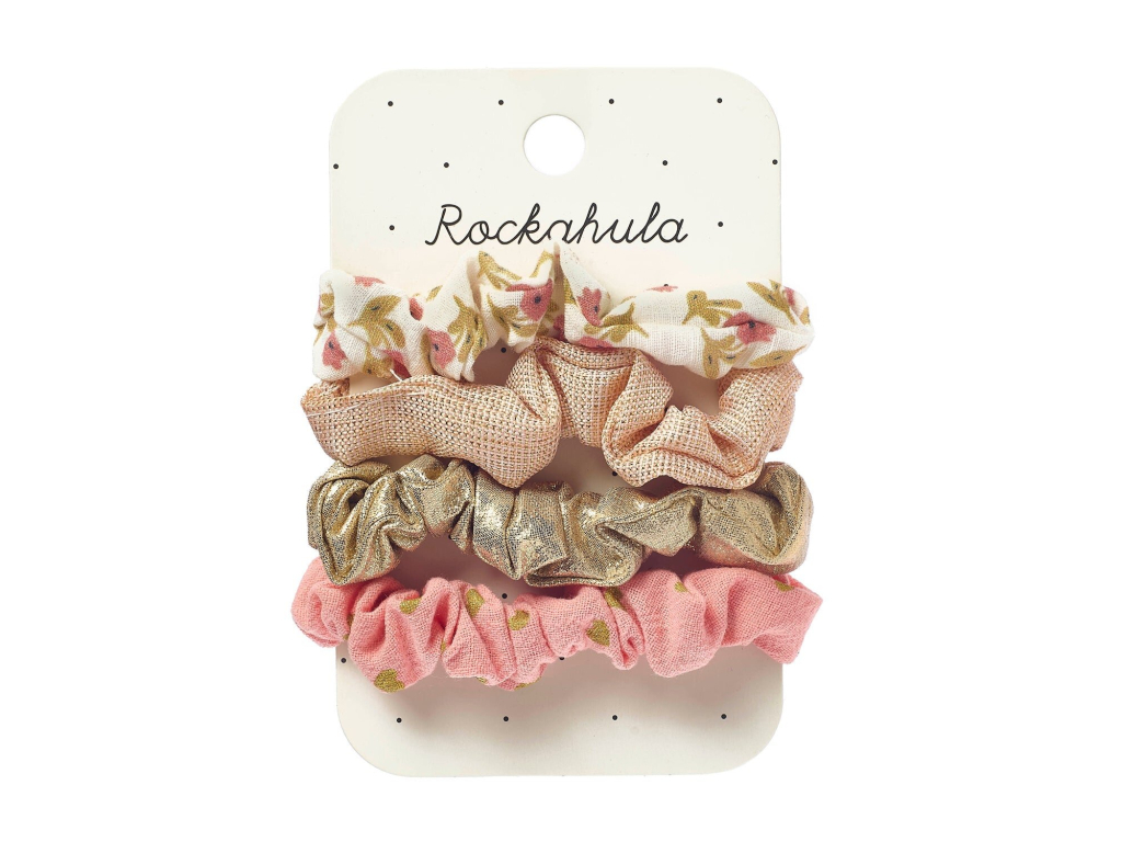 Balenie štyroch rozkošných scrunchie gumičiek na vlasy, každá z inej krásnej látky. S našou rozkošnou kvetinovou potlačou Elsie, ružovo-zlatou potlačou srdiečok a trblietavou ružovo-zlatou látkou. Ideálne na kombinovanie!