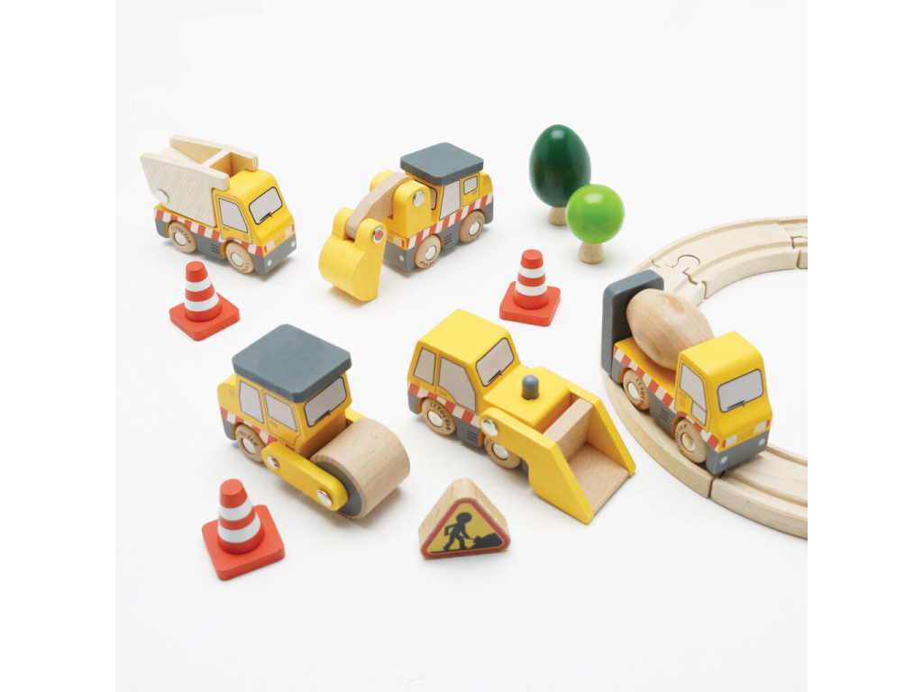 Postavme to! Súprava 5 stavebných vozidiel s pohyblivými dielikmi – domiešavač, nákladiak, nakladač, bager, valec, s plne funkčnými dielmi pre interaktívnu zábavu. Tieto vysoko odolné hračky sú vyrobené z odolného a pevného udržateľného kaučukového dreva. Ideálne pre začínajúcich staviteľov. V balení tiež 3 dopravné kužele a jedna značka. Všetky stroje sú pohyblivé. Tento set sa veľkostne hodí do garáží ak ostatným dopravným prostriedkom Le Toy Van.