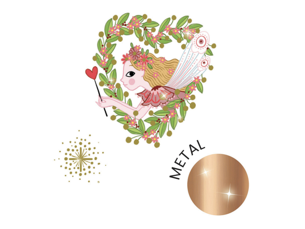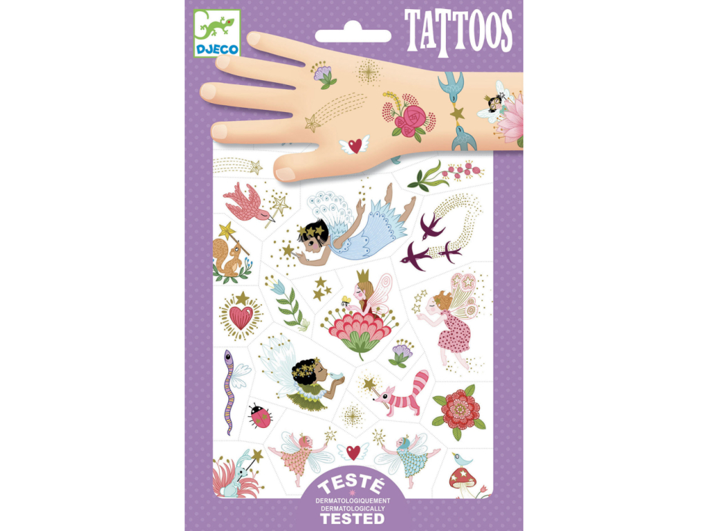 2 hárky dočasných tetovačiek s jemnými ilustráciami z láskavého sveta víl. Deti navyše poteší zlatý metalický lesk. Jednotlivé tetovačky sa z hárkov ľahko vytrhávajú. Aplikácia: odstráňte fóliu, priložte tetovačku na kožu, navlhčite podkladový papier, jemne pritlačte, papier stiahnite. Po obnosení odstráňte mydlovou vodou alebo jemným odličovacím prípravkom. Tetovačky sú dermatologicky testované.