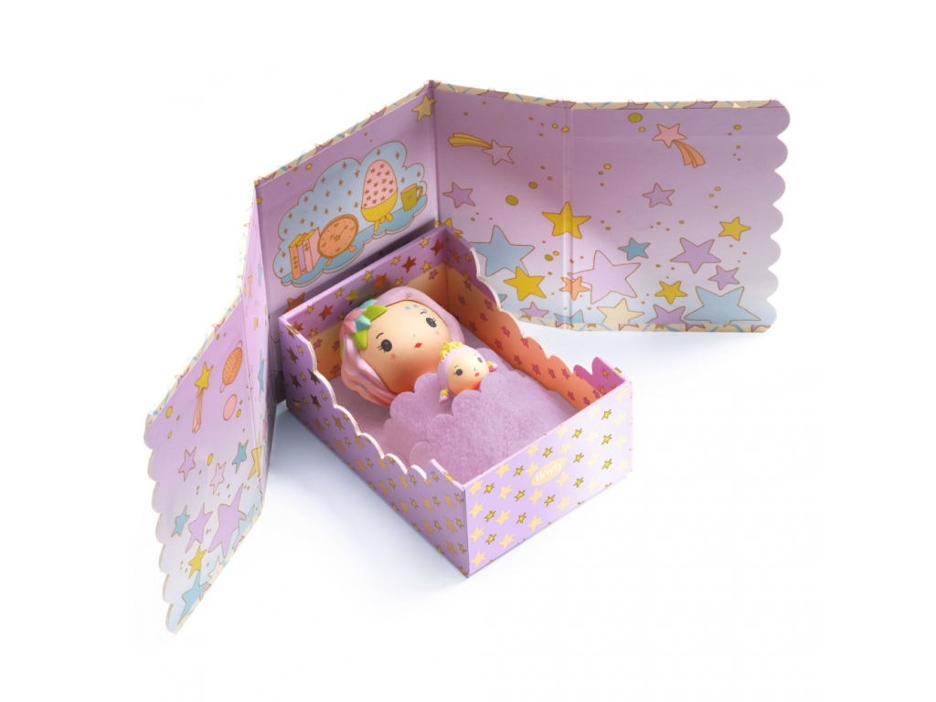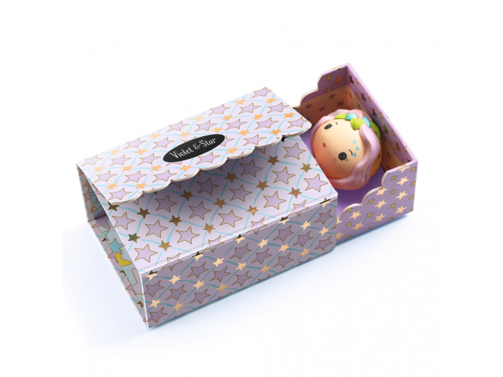 Figúrky z kolekcie Tinyly od Djeco. Každé Tinyly dievča je niečím typické a každé dopĺňa neobyčajná drobná figúrka. Fialovú tinylku Violet sprevádza kúzelná Hviezdička. Ich krásne ilustrovaná škatuľka sa obratom zmení na spálničku: postieľku s prikrývkou a stenu plnú hviezd.
