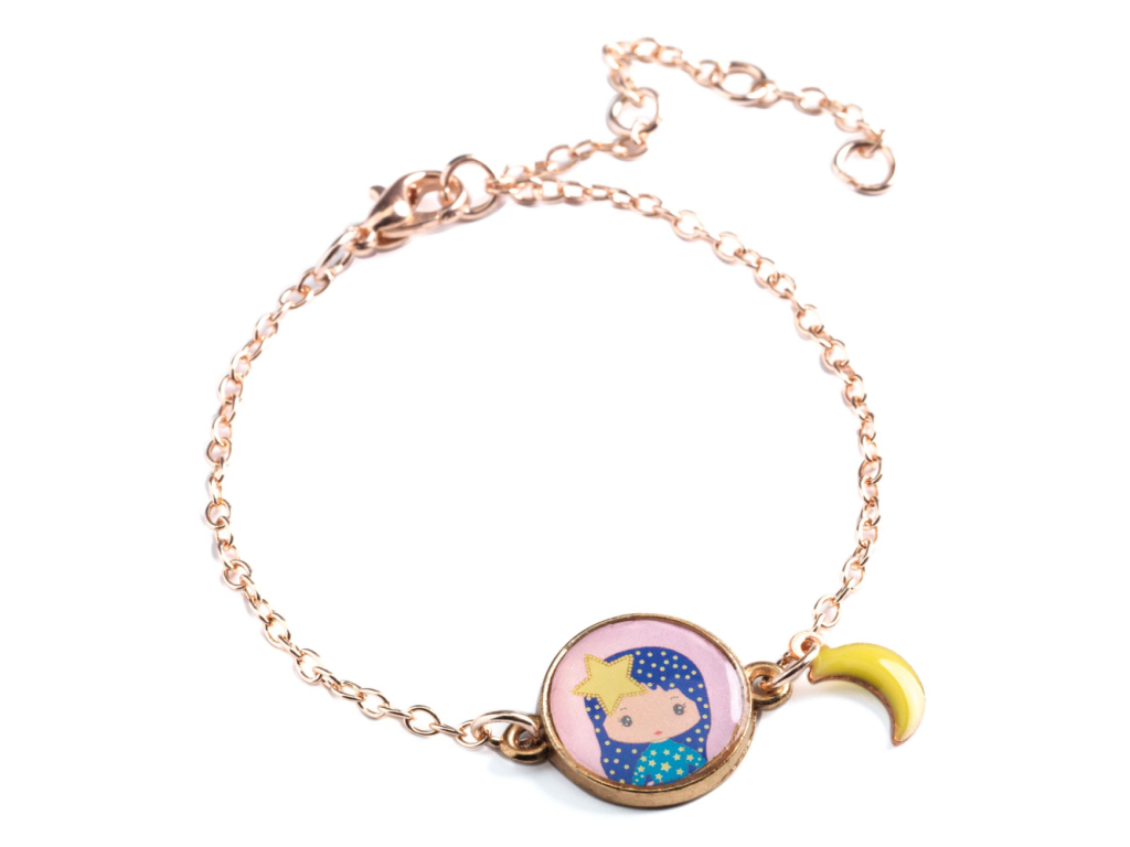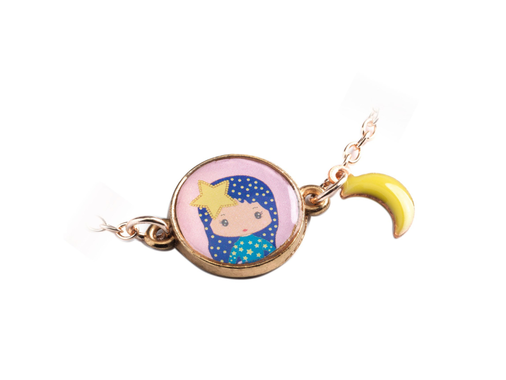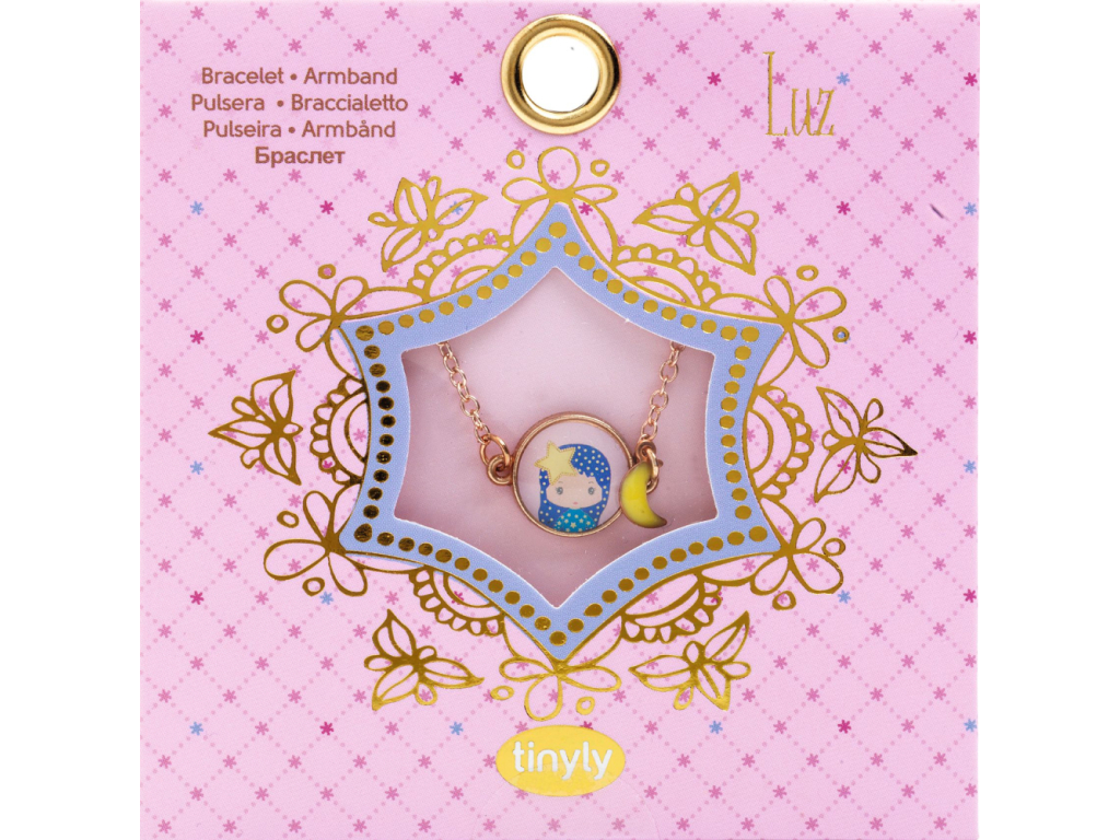Vkusný náramok s medailónikom a ozdôbkou v tvare kosáka mesiaca na pozlátenej kovovej retiazke. Medailónik zobrazuje portrét rojčivej Tinyly figúrky Luz od Djeco. Karabínková spinka a krúžky na retiazke umožňujú jednoducho prispôsobiť veľkosť náramka.