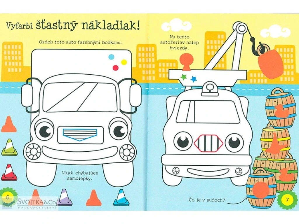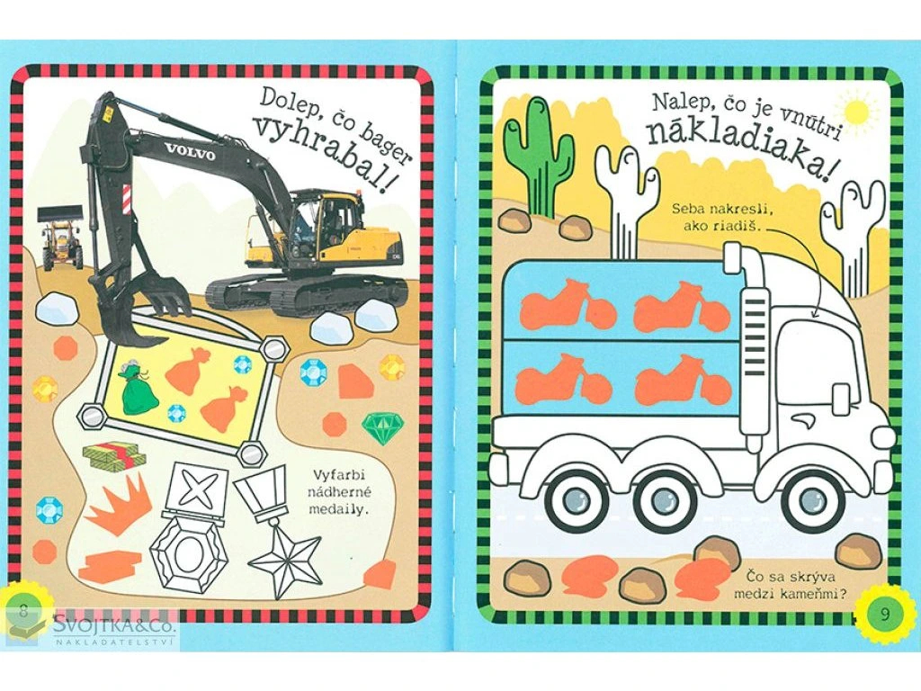 Nalep autá na kamión. Vyfarbi traktor svojimi obľúbenými farbami. Dolep samolepky toho, čo vyhrabal bager. Zistíš, ktorý z traktorov dôjde najskôr do cieľa? Nájdi v kontajneri šesť predmetov... Zabávaj sa pri množstve činností spojených s vyfarbovaním, doplňovaním a nalepovaním viac ako 1 000 samolepiek do tejto knižky plnej traktorov a nákladiakov, ktoré si môžeš nalepiť buď priamo do tejto knihy, alebo kamkoľvek budeš chcieť!