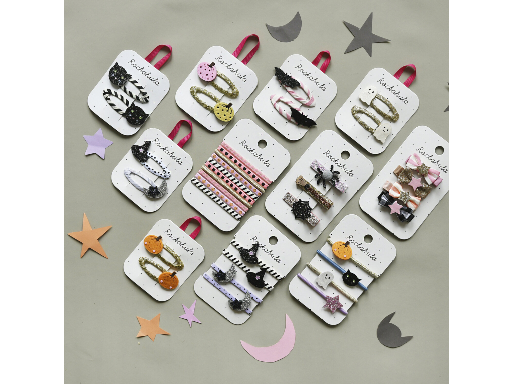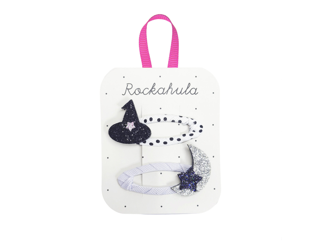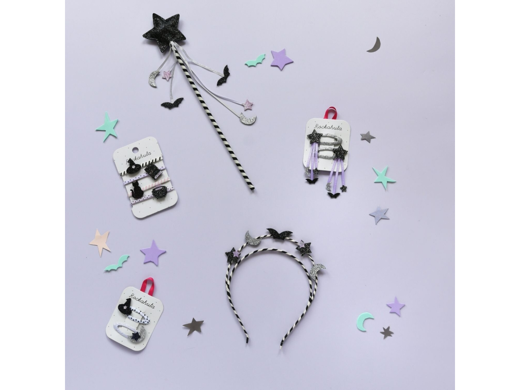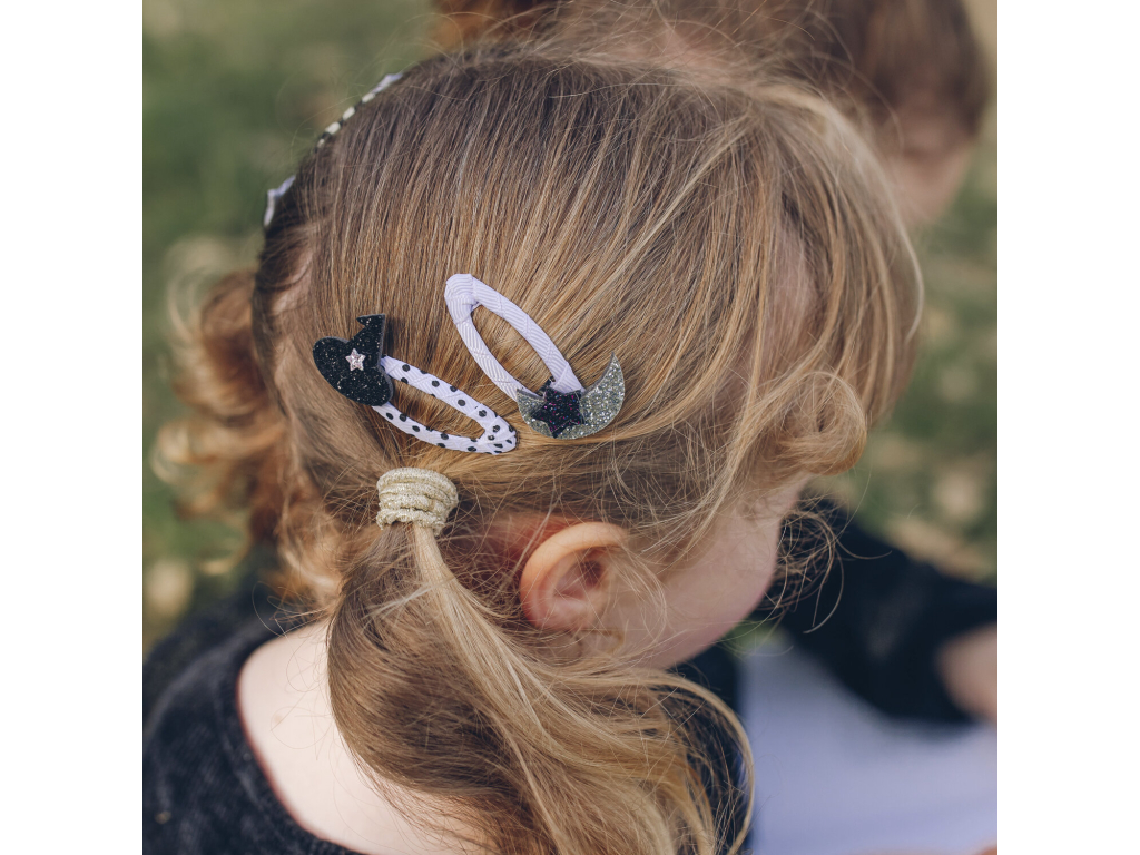 Pripravte sa na čarodejnícku hodinu s touto trblietavou magickou sadou sponiek. S trblietavým čiernym čarodejníckym klobúkom a strieborným mesiacom, pripevnenými na sponách omotaných sivou a bielou bodkovanou stuhou. Perfektný doplnok na halloweenske obdobie!