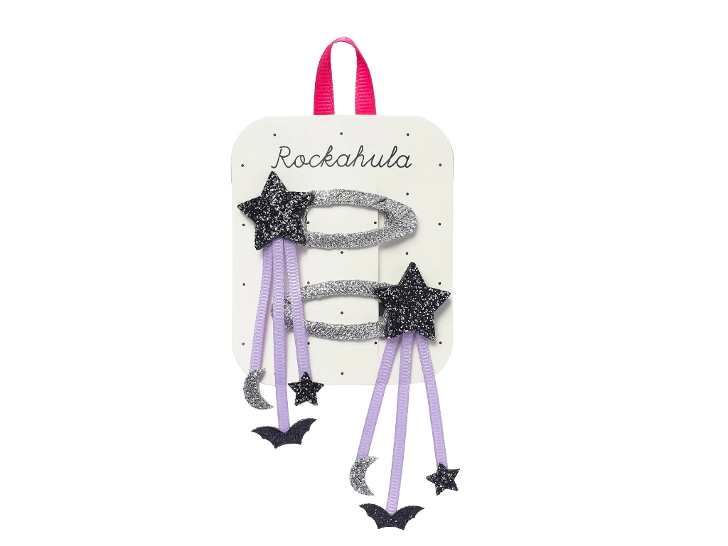Štýlové sponky s halloweenskym nádychom, ktoré dodajú účesu šmrnc aj trochu strašidelnej zábavy. 👻 Ozdobené trblietavými hviezdičkami a fialovými stužkami, skvele doplnia každý halloweensky outfit. Ľahko sa zapínajú a spoľahlivo držia vo vlasoch po celý deň. ✨