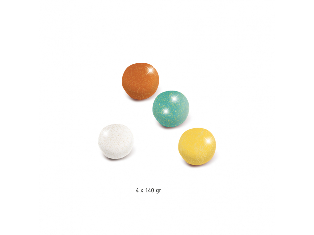 Skvelá mäkučká plastelína v 4 trblietavých farbách v kelímkoch s vrchnákom. Vhodná na voľnú kreatívnu činnosť a na precvičovanie jemnej motoriky u najmenších. Tvrdne na vzduchu, vďaka čomu sa hodí aj na modelovaciu činnosť – vymodeluj a nechaj vyschnúť.