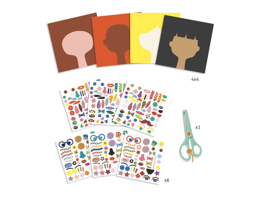 Obsah: 16x obrázok (4 rôzne portréty po 4 ks), 6x hárok so samolepkami, 1x nožnice