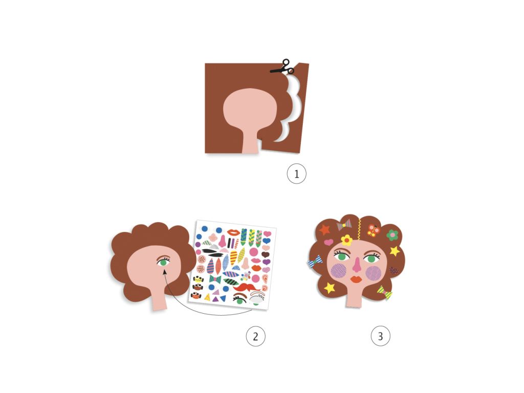 Sada 16 obrázkov – portrétov na dotvorenie: účes nožničkami, styling samolepkami. Obsahuje detské nožnice s oblým hrotom a prevodovou páčkou pre bezpečné a ľahké strihanie. Zo salóna krásy nik neodíde nespokojný!