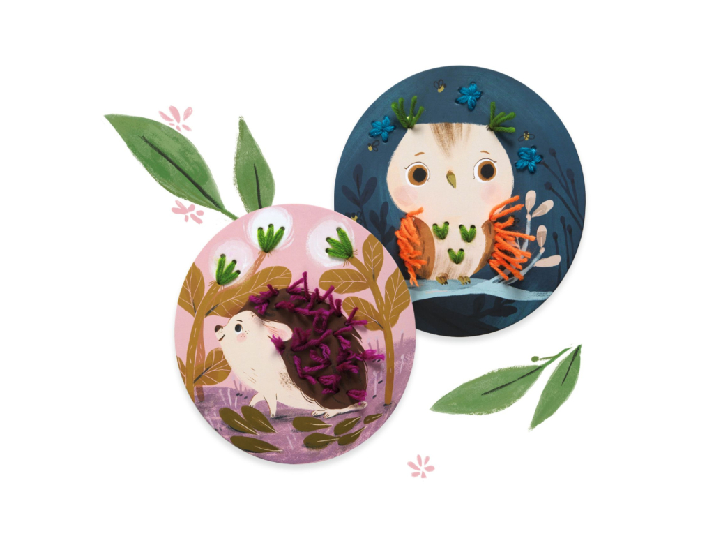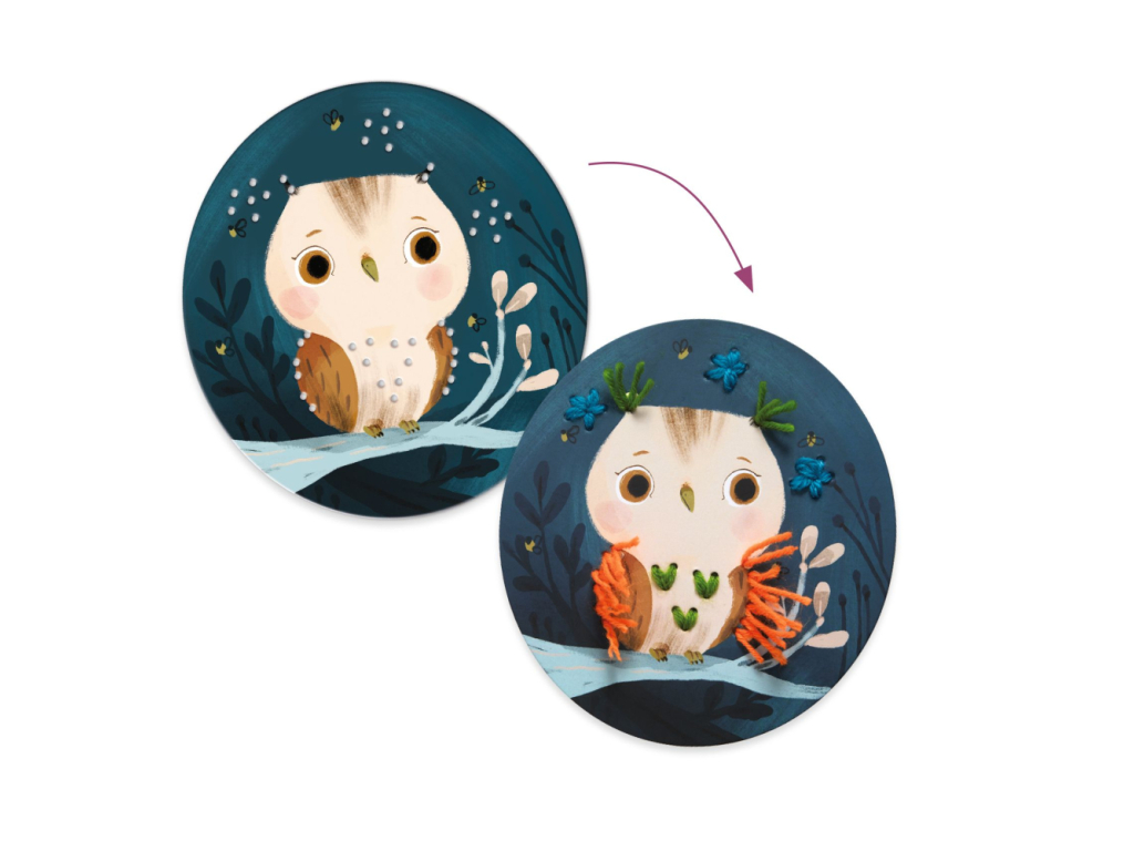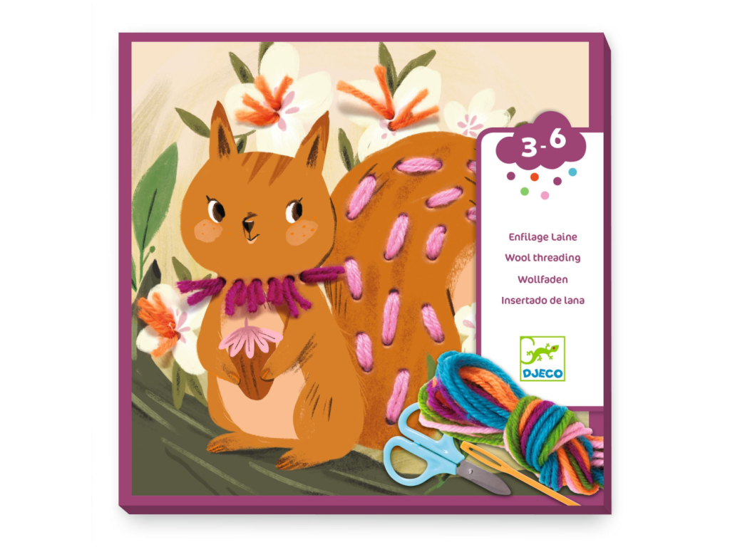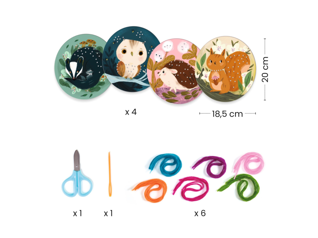 4 ilustrované kruhy z hrubého kartónu s otvormi. 20 x 50 cm prameňov vlny. 5 farieb. 1 ihla. 1 pár nožníc. 1 návod.