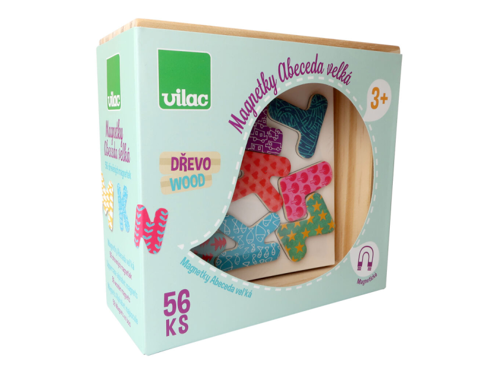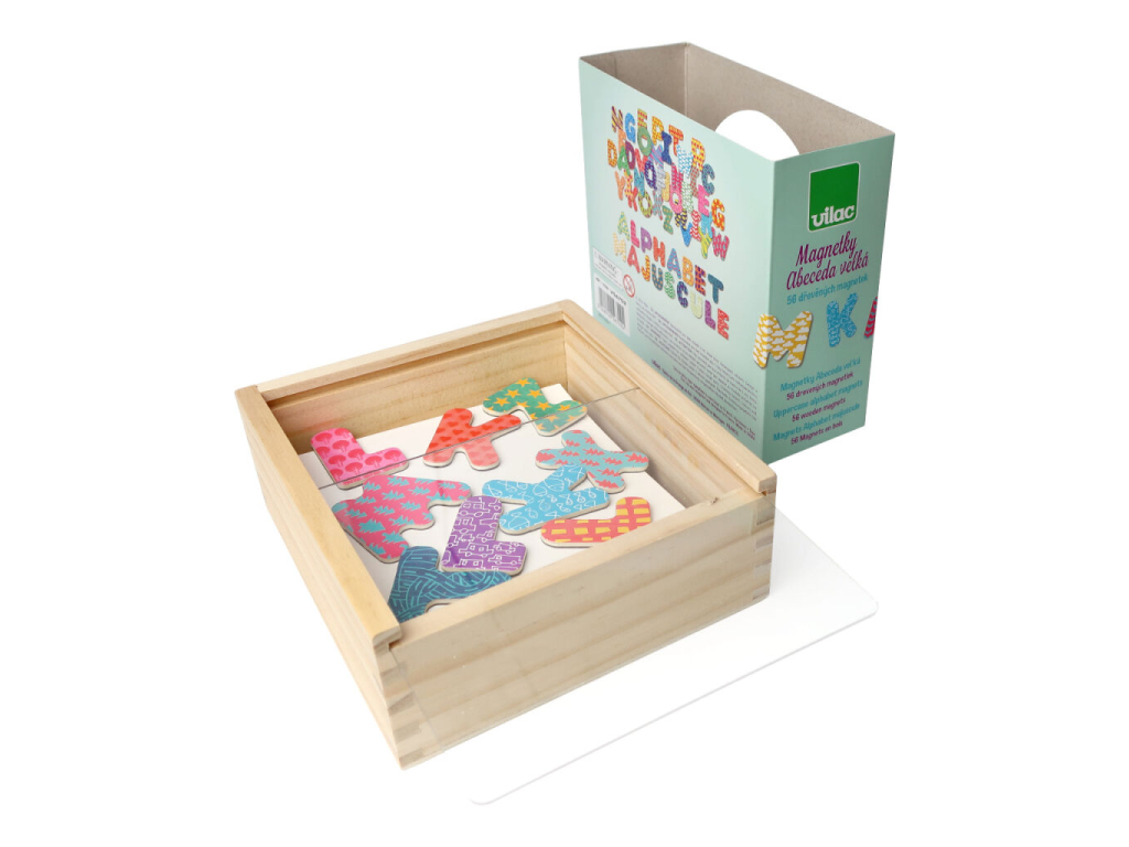 Magnetické, drevené písmená abecedy môžu deti naučiť ich prvé slová. Je možné sa s nimi hrať na chladničke alebo magnetickej tabuľke. Sú zdobené pestrou paletou pútavých farieb a jedinečných vzorov. Každé písmeno je tak ešte ľahšie rozpoznateľné a motivuje k vytváraniu stále nových spojení.