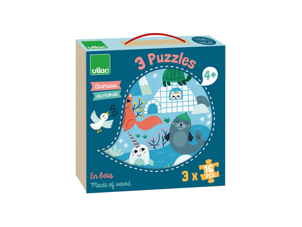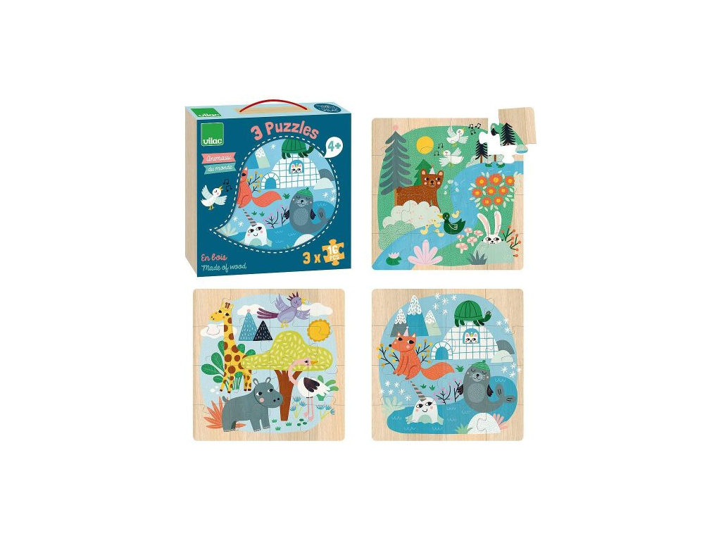 Sada 3 obrázkových puzzle v praktickej krabičke. Krásne ilustrované drevené puzzle so zvieratkami z celého sveta rozvíja detskú motoriku a logické myslenie. Pevné drevené dieliky sú ideálne do malých detských rúk. Skvelá zábava a učenie v jednom!