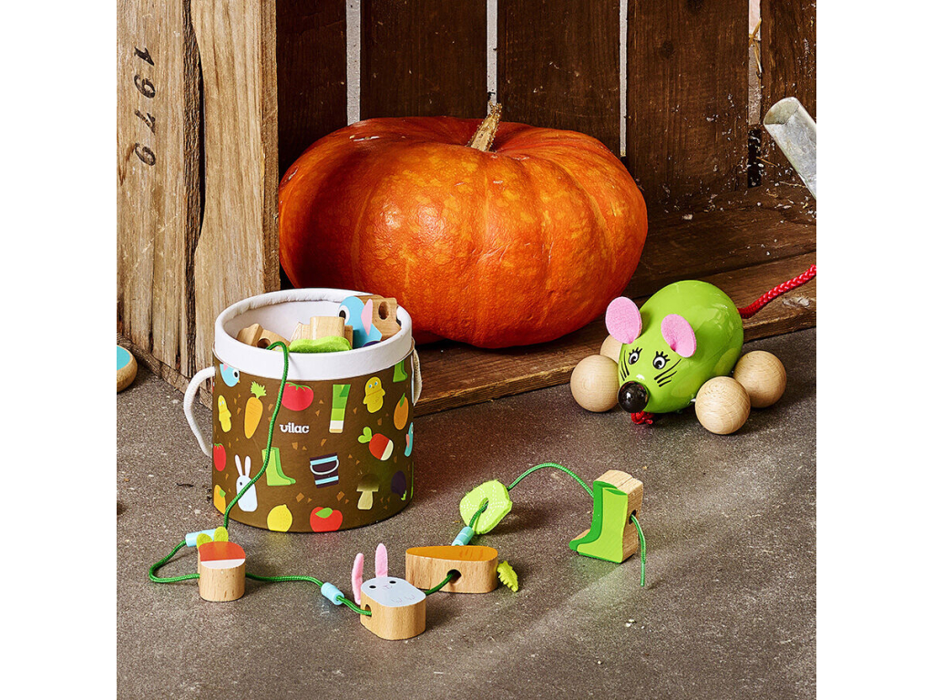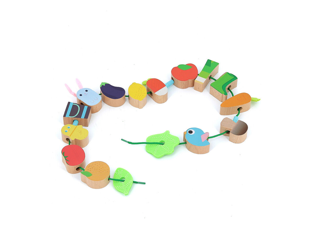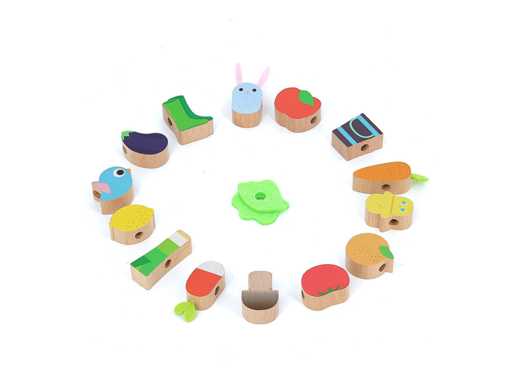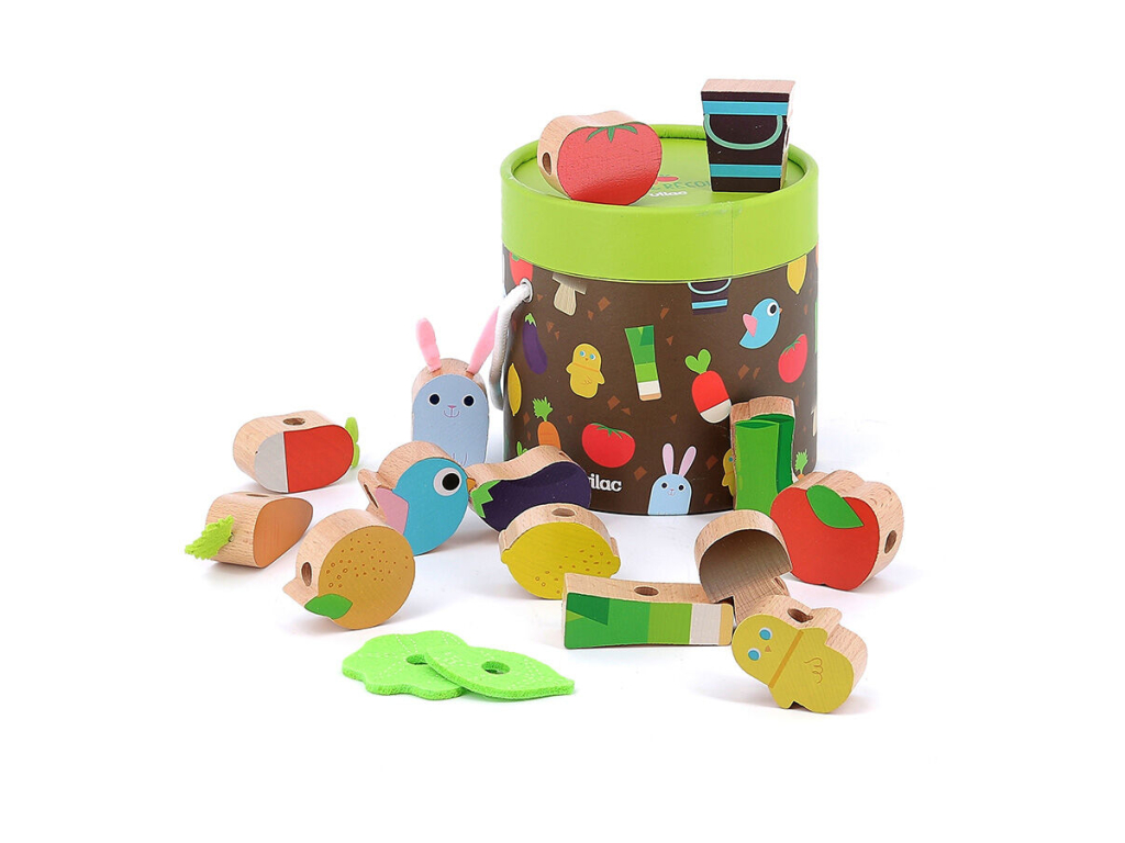 Farebná drevená hračka, ktorá pomáha deťom rozvíjať jemnú motoriku, trpezlivosť a koordináciu ruka–oko. Deti môžu prevliekať korálky v tvare kvetov, zvieratiek či zeleniny a vytvárať vlastné záhradné príbehy. Vyrobená z kvalitného dreva s netoxickými farbami, vhodná pre deti od 2 rokov.