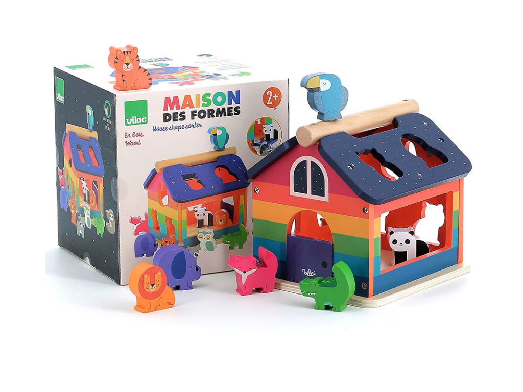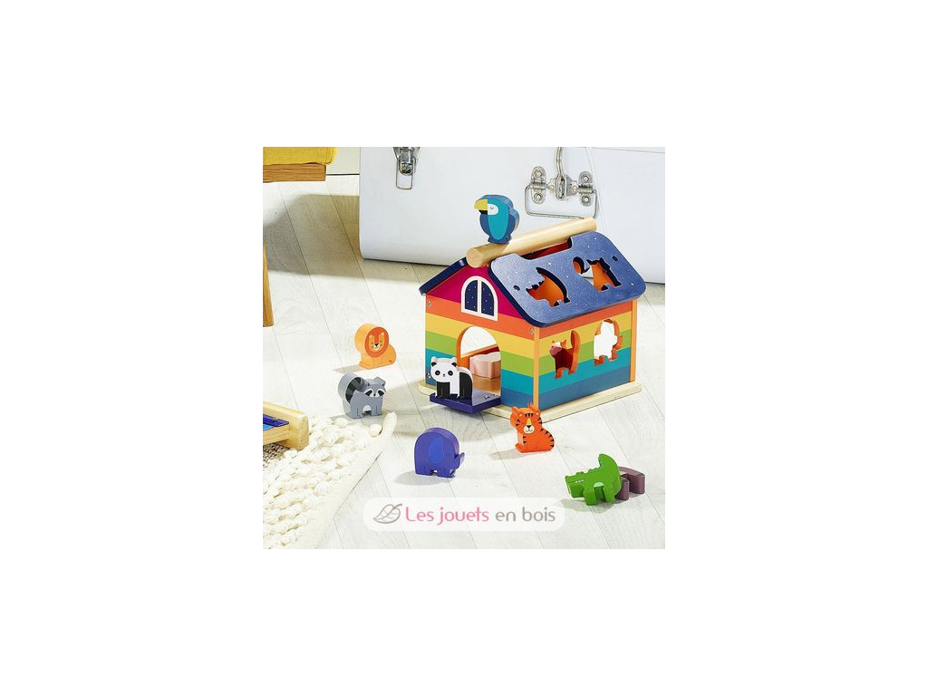 Triedením a premiestňovaním zvieratiek sa deti zábavne učia rozoznávať tvary, a dajú sa tak po krôčikoch viesť k samostatnej hre v súlade s výukovými metódami Montessori. Rozmanité pestrofarebné figúrky môžu správnym pomenovávaním a priraďovaním charakteristických vlastností pomôcť s rozvojom poznávacích zručností a fantázie. Domček je vybavený otvárateľnými dvierkami, ktoré sú pružne zavesené tak, aby detským prstíkom nehrozilo priškripnutie. Praktické madlo na streche umožňuje ľahkú manipuláciu a prenášanie. Hračka kombinuje robustné diely z masívneho dreva a odolné preglejky, ktoré zaručujú vysokú životnosť.