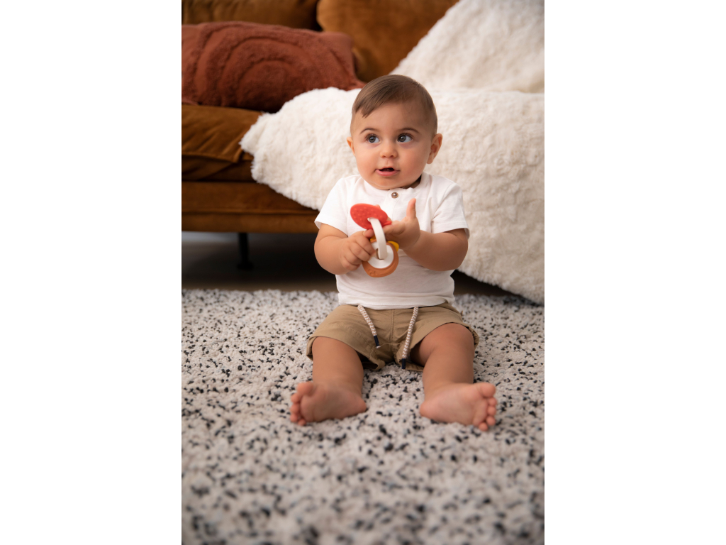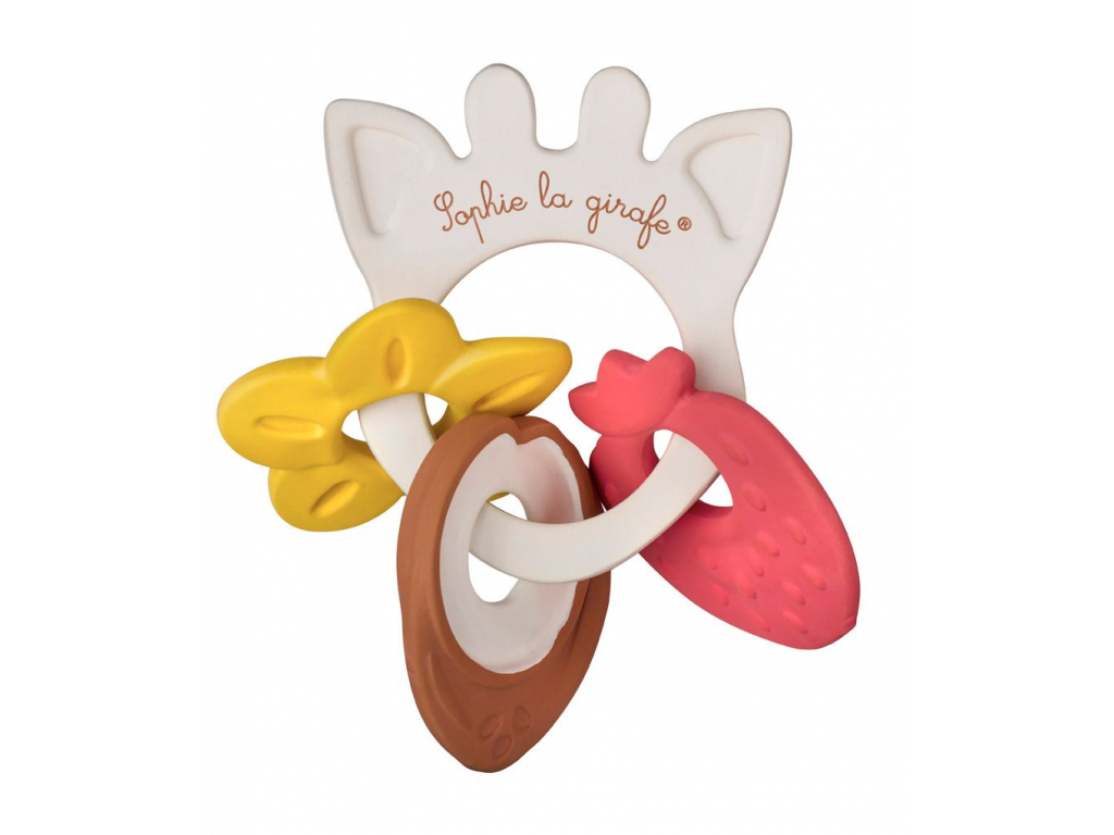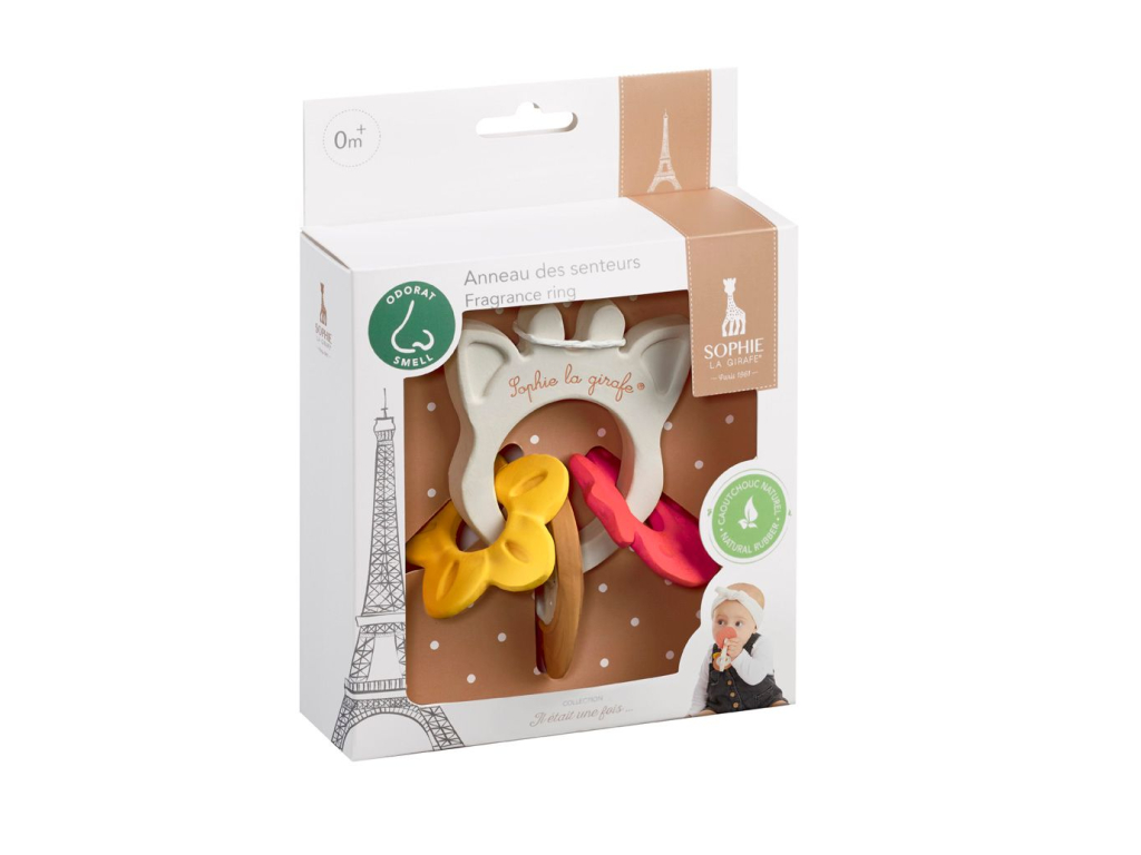 Ľahko uchopiteľný krúžok z prírodného kaučuku sa skladá z 3 rôznych medailónikov s jemnou sladkou prírodnou vôňou vanilky, jahôd a kokosu. Dieťatko objavuje a prebúdza svoj čuch vďaka prírodnému kaučuku s jemnou prírodnou vôňou.