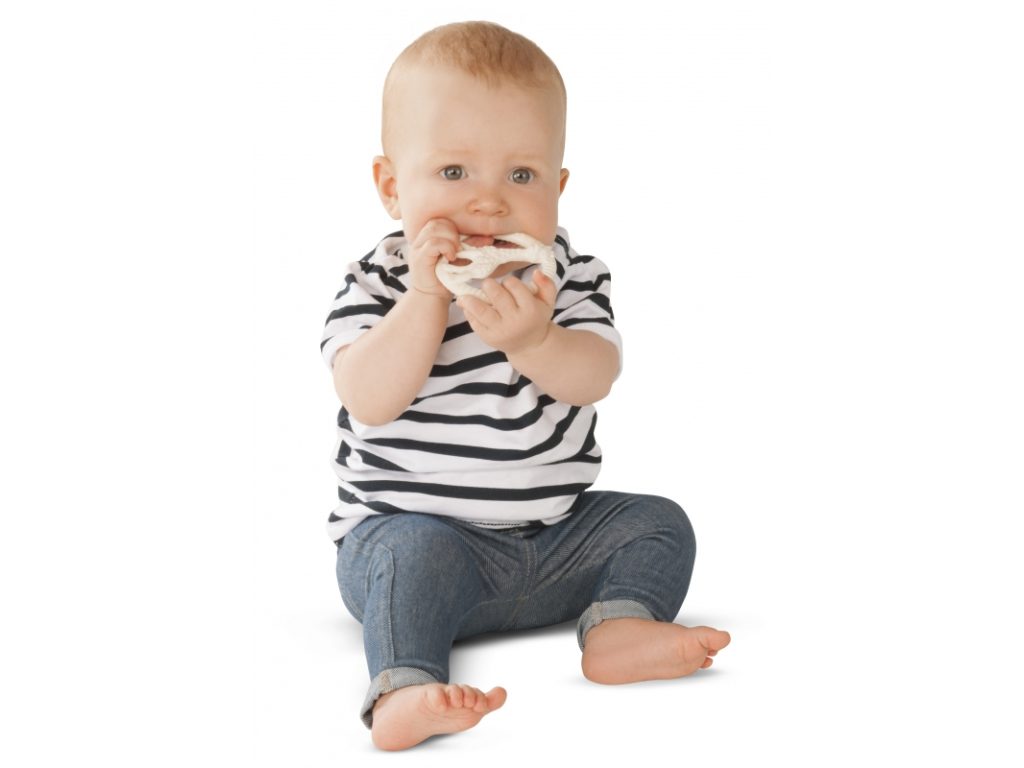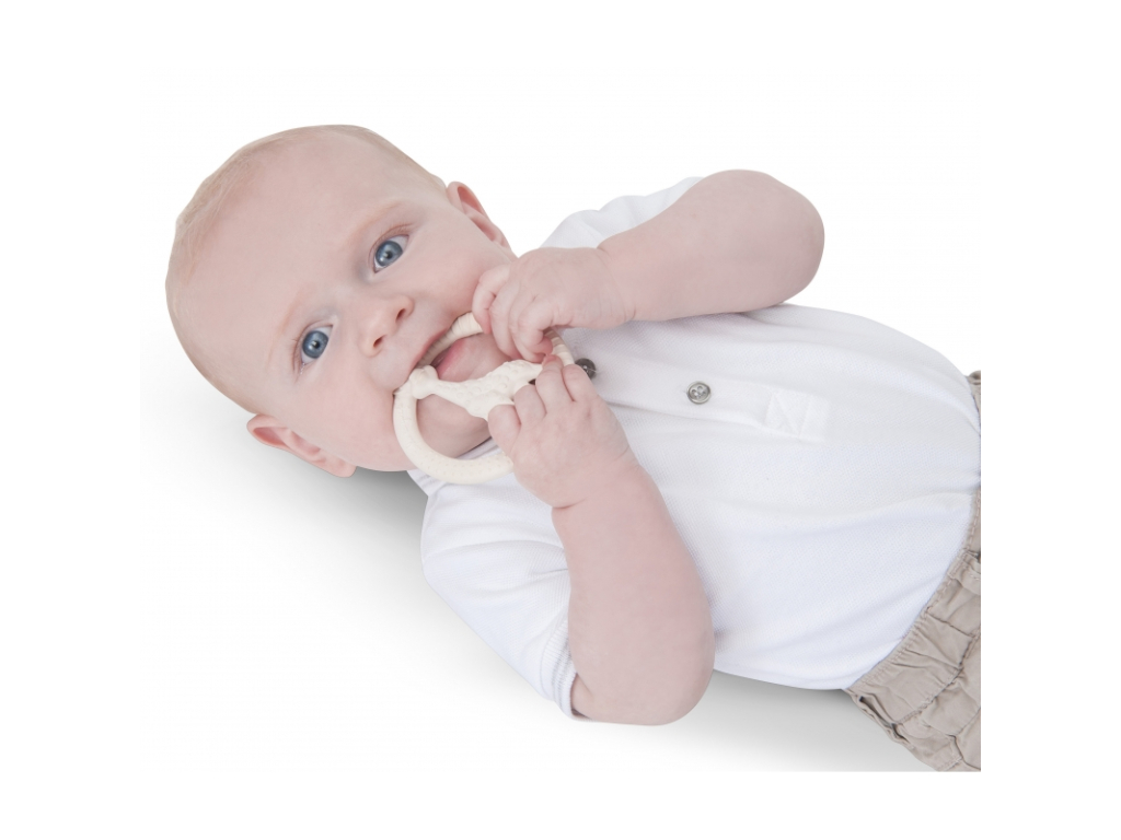 Hryzátko vyrobené zo 100% prírodného kaučuku. Vypuklé časti masírujú detské ďasná pri raste zúbkov.