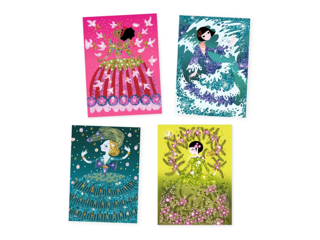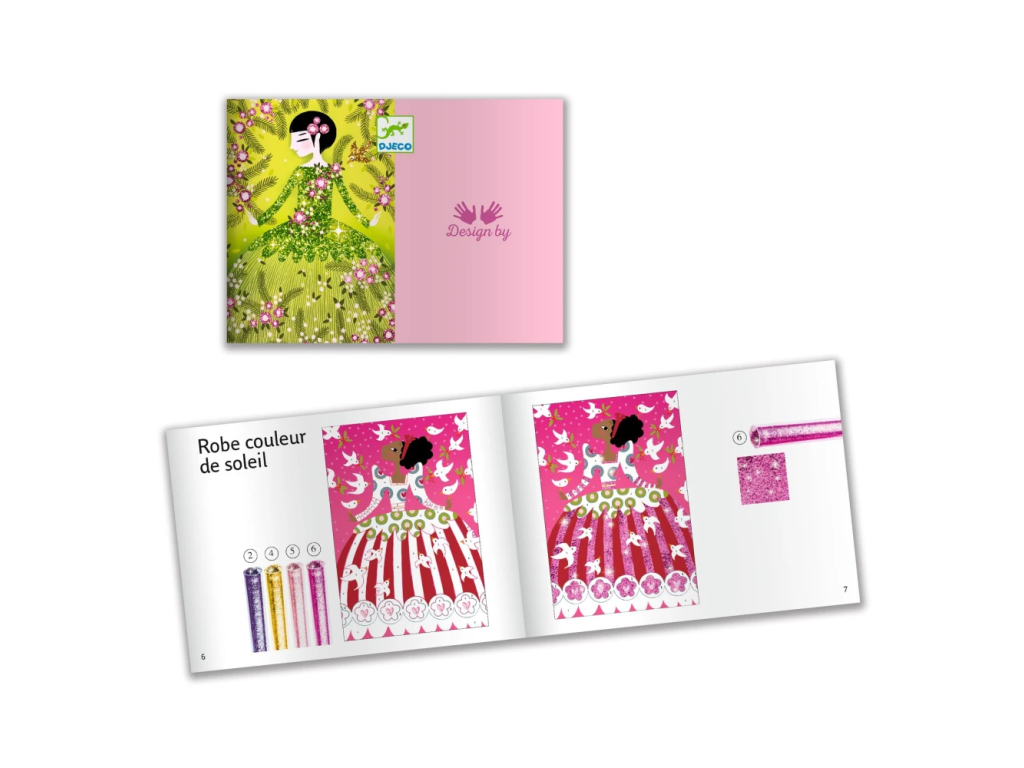 Trblietavé predlohy – Šaty je tvorivá sada pre deti, ktorá obsahuje predlohy elegantných šiat pripravené na ozdobovanie trblietkami.