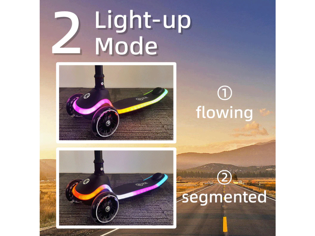 Túto kolobežku budú Vaše deti milovať! Nielenže svietia kolieska, keď sa otáčajú, ale svieti aj doska, na ktorej dieťa stojí a navyše v rôznych farebných a blikajúcich módoch. Bezpečná a stabilná detská kolobežka (3–8 rokov) s LED kolieskami a LED osvetlením v nášľapnej doske.