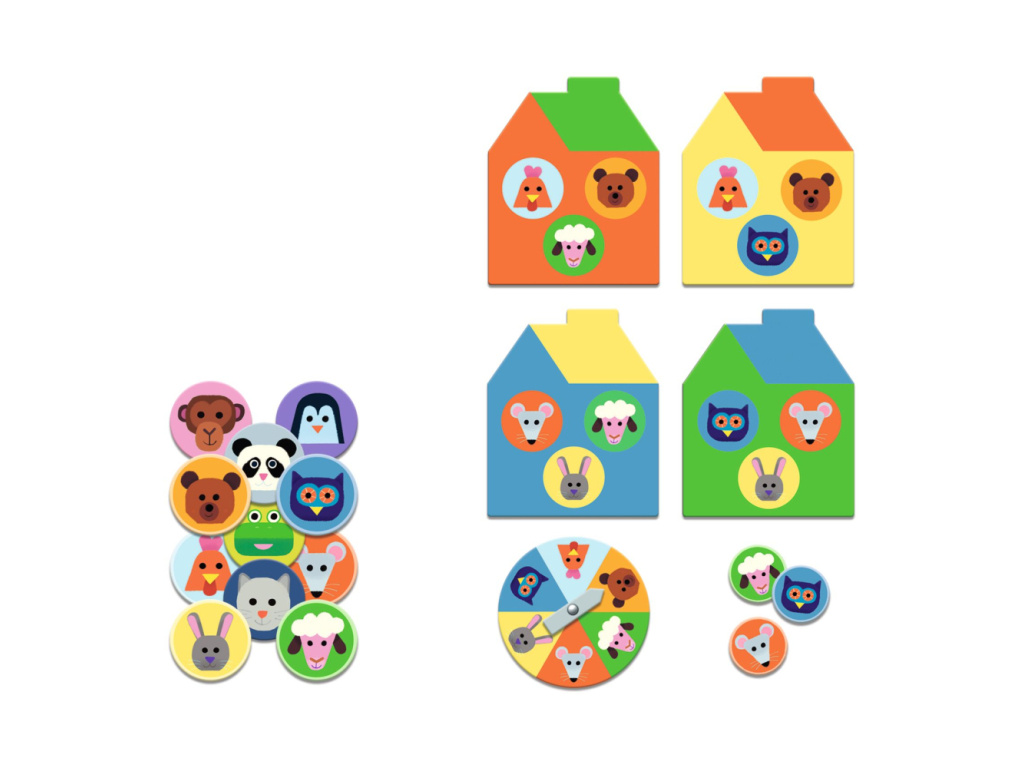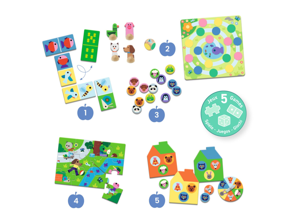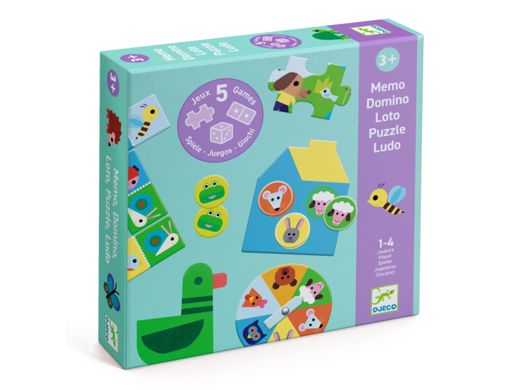 Sada obsahujúca 5 hier v DJECO podaní: Domino, Ludo (hádzanie kockou a posúvanie sa po hracej doske), Pexeso, Puzzle a Loto, pri ktorých sa deti zabavia a zároveň si rozvíjajú logické myslenie, pamäť a pozorovacie schopnosti.