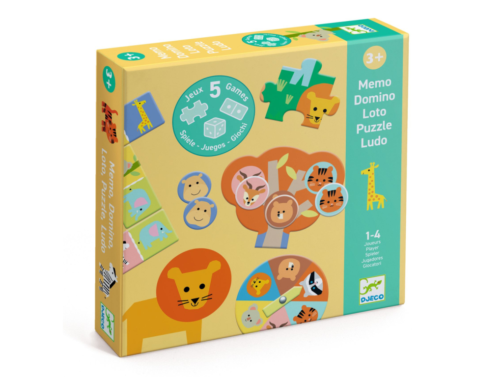 Sada obsahujúca 5 hier v DJECO podaní: Domino, Ludo (hádzanie kockou a posúvanie sa po hracej doske), Pexeso, Puzzle a Loto, pri ktorých sa deti zabavia a zároveň si rozvíjajú logické myslenie, pamäť a pozorovacie schopnosti.